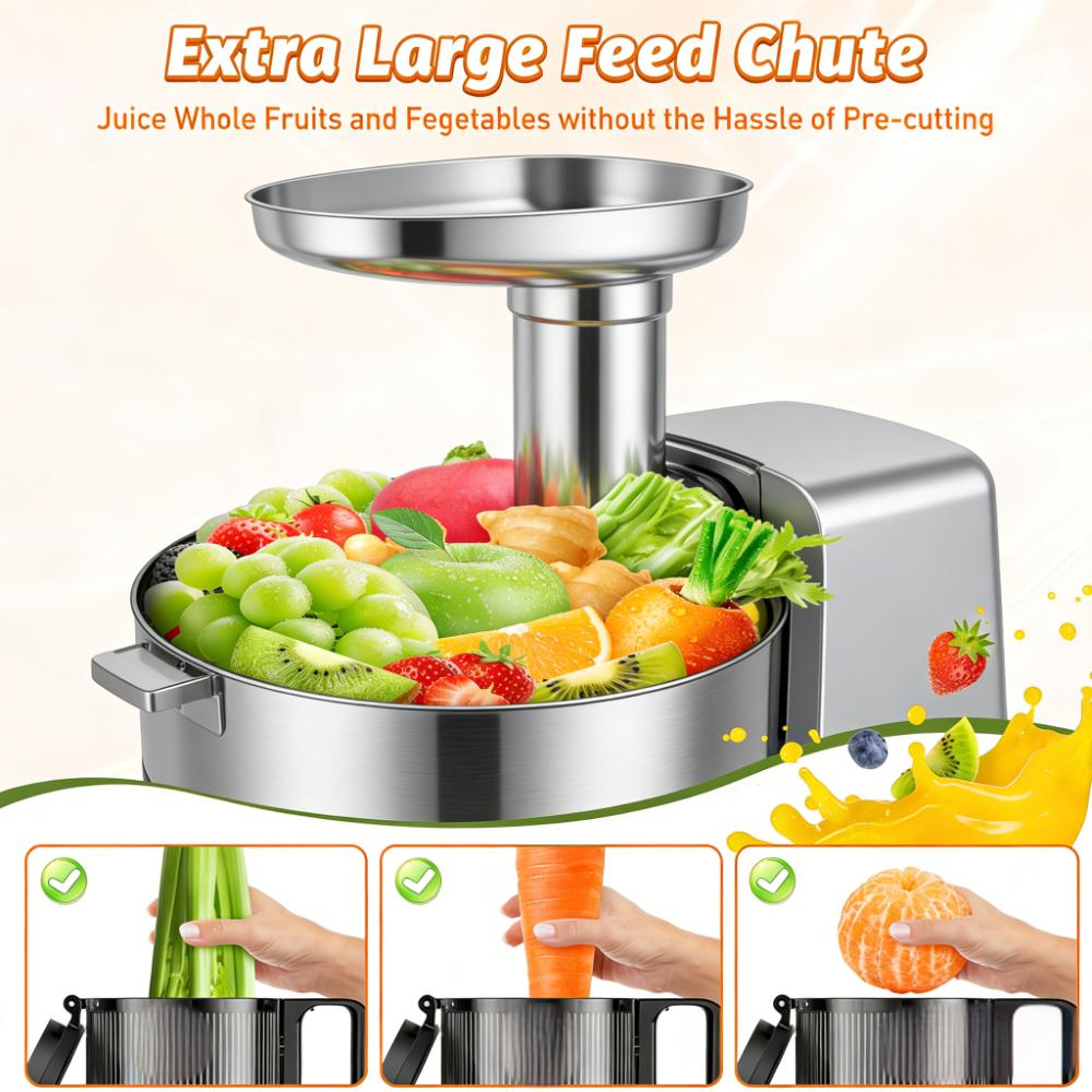 - Extra-Large Feed Chute: Juices whole fruits/vegetables without pre-cutting
